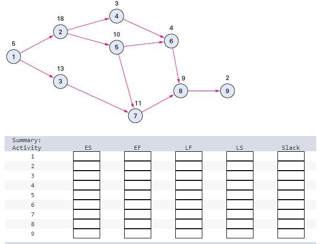 For each of the problems listed, determine the followingquantities for each activity: the earliest start time, latest starttime, earliest finish time, latest finish time, and slack time.List the critical activities, and determine the expected durationof the project.