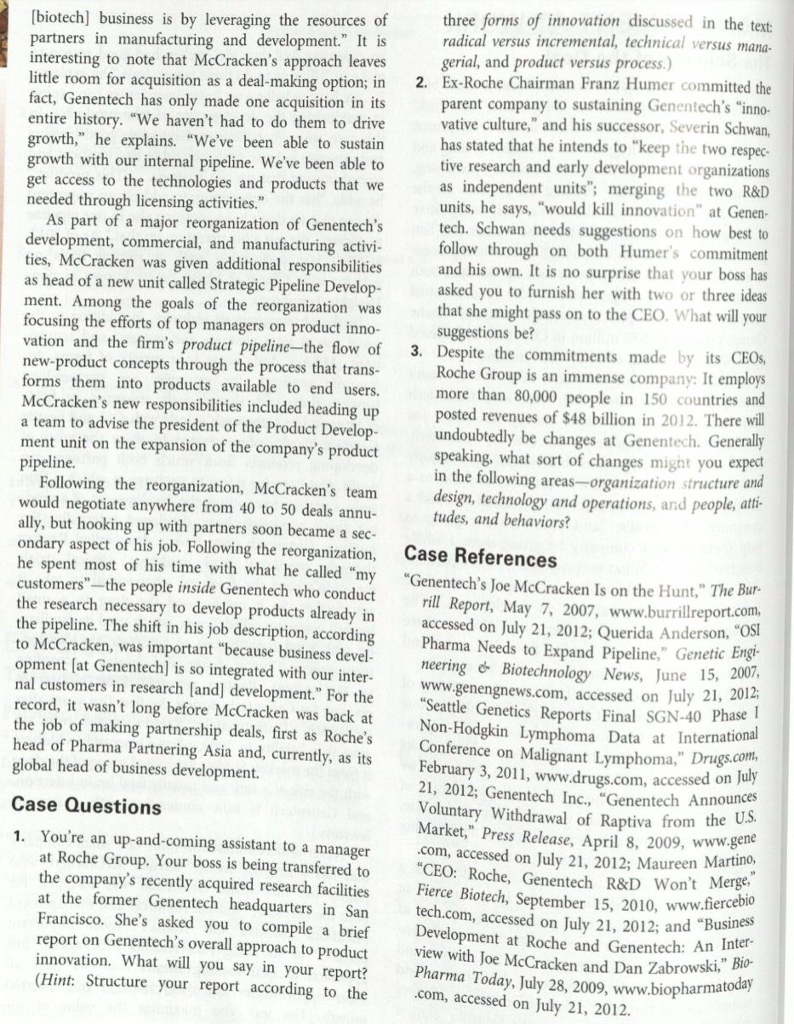 At the former Genentechheadquarters in San Francisco. She’s asked you to compile a briefreport on Genentech’s overall approach to product innovation. Whatwill you say in your report? (Hint: Structure your reportaccording to the three forms of innovation discussed inthe text (radical versus incremental, technical versusmanagerial and product versusprocess.)