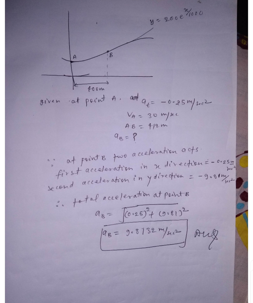 1. Consider a vehicle which moves along the path as shown in Figure Q1. At the instant A, the velocity of the vehicle was found to be 30 m/s and then the velocity decreases at a constant rate of at -0.25 m/s. If the length of the path AB 412 m, determine the (20 Marks) acceleration of the vehicle at instant B y- 200 e 1000 400 Figure Q1