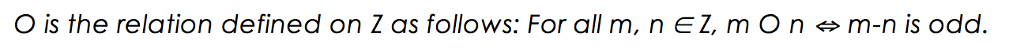 O is the relation defined on Z as follows: For all m, n EZ, m O n m-n is odd. Show transcribed image text