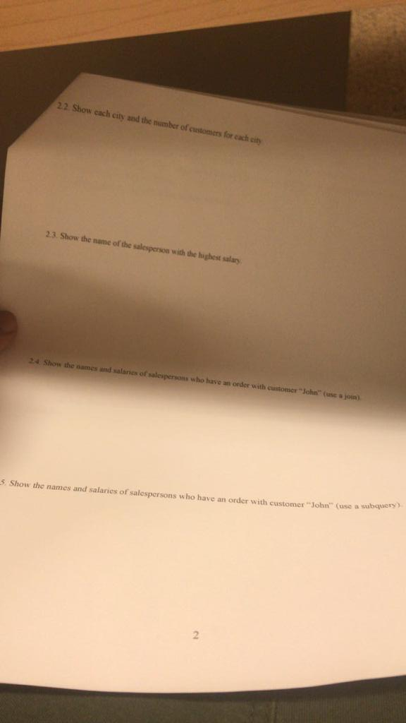 2. SQL statements (5×7 – 35 points) Consider the following relational tables SalesPerson (SalesPersonID, SalesPersonName, Salary) Customer (CustomerID, CustomerName, City) SalesOrder (Order Number, CustomerID, Sales PersonlD, Amount) Please use SQL statements to answer