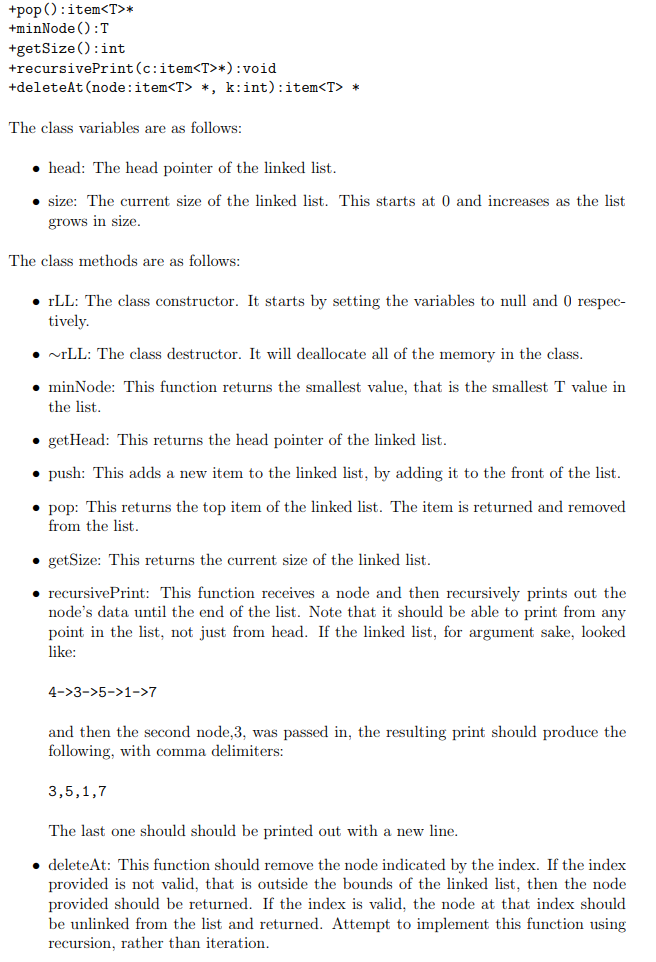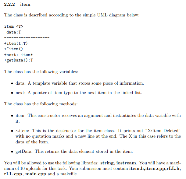 2.2.1 rLL The rLL is the recursive linked list class. It has the following definition based on the simple UML diagram below: -head : item<T>* -size int +rLLC) +”rLLO tgetHead(): item<T>* +push(newItem:item<T>*):void Show transcribed image text