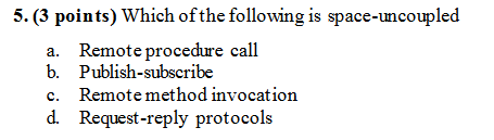 4. (3 points) Which of the following is more burdensome for the application programmer a. Remote procedure call b. Publish-subscribe c. Remote method invocation d. Request-reply protocols Show transcribed image text