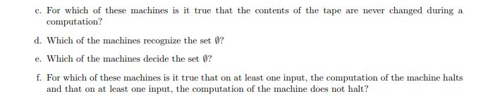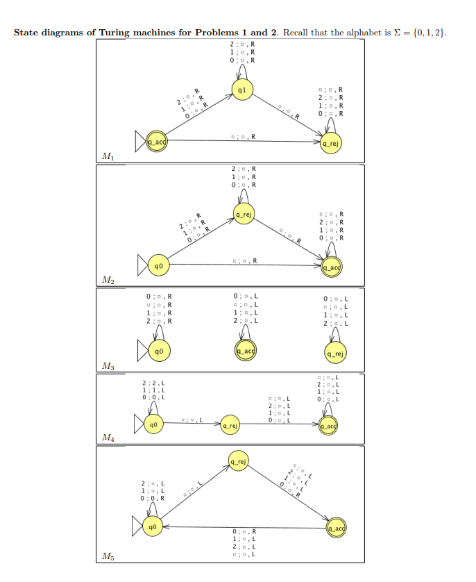 The alphabet for this question is {0, 1, 2}. The state diagramsof the Turing machines for this question are on the last page ofthe assignment. For each question below, list all the machines fromthe list M1, M2, M3, M4, M5 for which the answer is “yes”, or writeNone otherwise