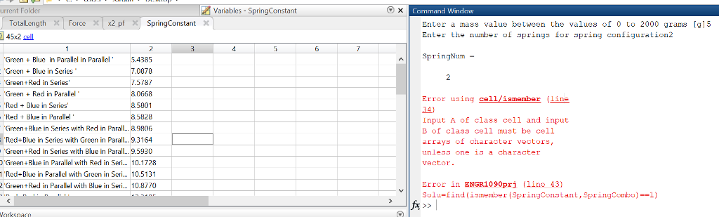 I am trying to search for the spring combination in this case itis the variable SpringCombo in a list of spring combinations inexcel which I loaded on to MATLAB. I put the actual screenshot ofthe data loaded onto MATLAB and also a screenshot of the actualexcel worksheet.
