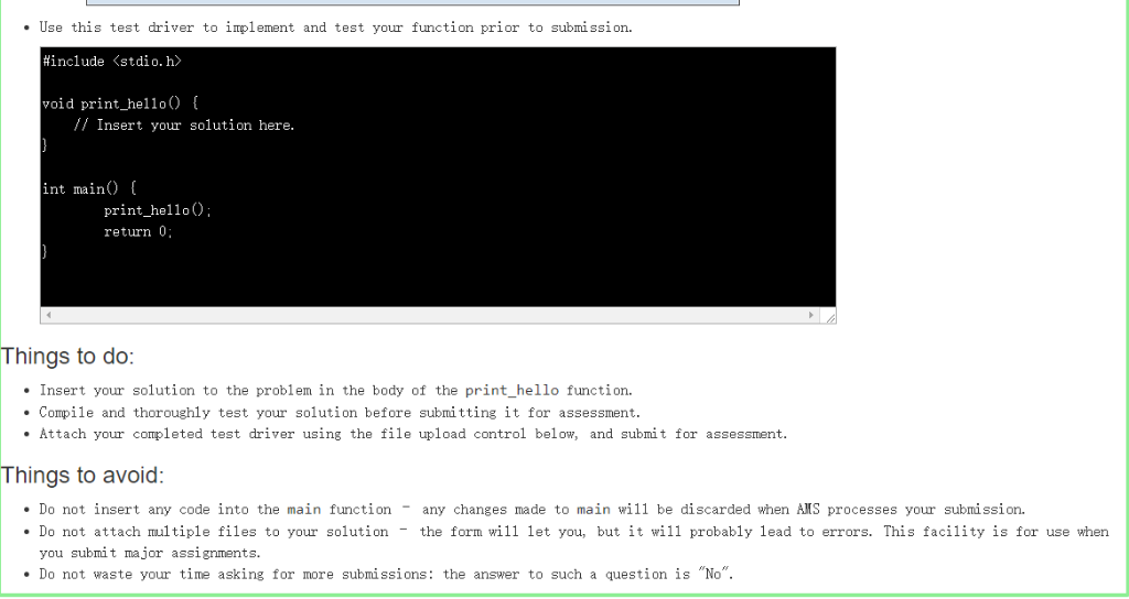 Complete the implementation of the print_hello function, according to the following specification: Parameters: The function expects no arguments. Returns: The function produces no result (i.e. the return type is void). Process: 0 Emi t the text “Salutations I hope you enjoyfollowed by a linefeed character, to the standard output stream. Notes When a person having student number n9999999 completes the exercise, the results look similar to the following image. Your version of the question may request a