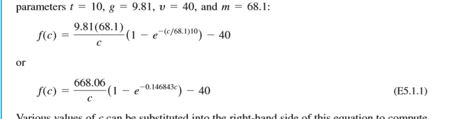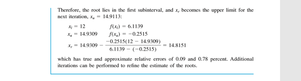![EXAMPLE 5.5 False Position Problem Statement. Use the false-position method to determine the root of the same equation investigated in Example 5.1 [Eq (E5.1.)]. Solution. As in Example 5.3, initiate the computation with guesses of x,-12 and 16 First iteration: xi = 12 x = 16 x,= 16- f(x) = 6.1139 f(x)=-2.2303 2.2303(12- 16) 6.1139 (2.2303) = 14.309 which has a true relative error of 0.88 percent. Second iteration: f(x)f(x) -1.5376](https://media.cheggcdn.com/media%2Fec4%2Fec462748-9748-4e2a-91bc-873176a79166%2FphpxJ4PKg.png)