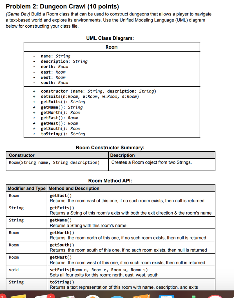 We were unable to transcribe this imageFacts . Each Room object contains references to up to four other Room objects . toString() should include the rooms’s name, room’s description, and the method getExits() Software Architecture: The Room class is designed to be instantiated by Dungeon class which is used by the Game class See the UML object diagram below: UML Object Diagram contains Game Dungeon gets from Dungeon i or