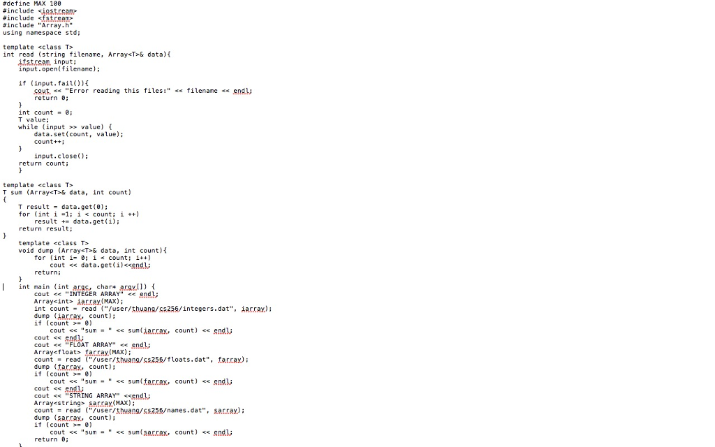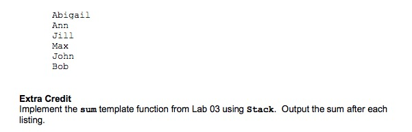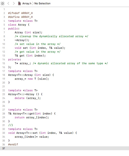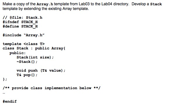 Make a copy of the Array.h template from Lab03 to the Lab04 directory. Develop a Stack template by extending the existing Array template. // file: Stack.h #ifndef STACK H define STACK H include “Array . h” template <class T> class Stack : public Arrayf public Stack (int size) Stack ( void push (T& value); T& pop ); /**provide class implementation below** #endif Show transcribed image text